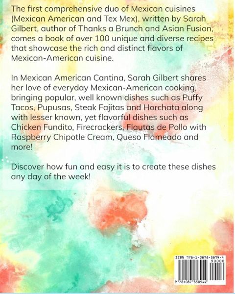 The first comprehensive duo of Mexican cuisines (Mexican American and Tex Mex); written by Sarah Gilbert, author of Thanks A Brunch and Asian Fusion, comes a book of over 100 unique and diverse recipes that showcase the rich and distinct flavors of Mexican American cuisine. In Mexican American Cantina, Sarah Gilbert shares her love of everyday Mexican American cooking- bringing popular, well known dishes such as Puffy Tacos, Horchata, Queso Blanco and Baja Fish Tacos along with lesser known, yet flavorful dishes such as Queso Flameado, Flautas de Pollo with Raspberry Chipotle Cream, Birria Tacos and more! Discover how fun and easy it is to create these dishes any day of the week!