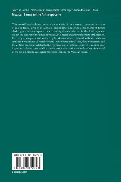 This contributed volume presents an analysis of the current conservation status of major faunal groups in Mexico. The chapters describe a prognosis of future challenges, and also explore the expanding threats inherent in the Anthropocene within the context of the unique physical, biological and cultural aspects of the nation. Covering 27 chapters, and written by Mexican and international authors, this book analyzes a wide range of vertebrate and invertebrate animal taxa, their ecosystems and the critical processes related to their present conservation status. This volume is an important reference material for researchers, conservationists and students interested in the biological and ecological processes shaping the Mexican fauna.