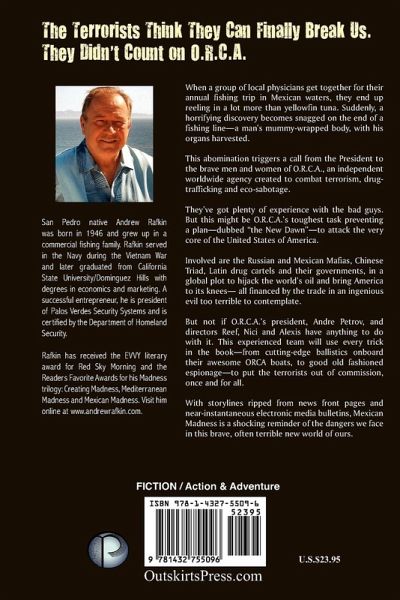 The Terrorists Think They Can Finally Break Us. They Didn't Count on O.R.C.A. When a group of local physicians get together for their annual fishing trip in Mexican waters, they end up reeling in a lot more than yellowfin tuna. Suddenly, a horrifying discovery becomes snagged on the end of a fishing line¿a man's mummy-wrapped body, with his organs harvested. This abomination triggers a call from the President to the brave men and women of O.R.C.A., an independent worldwide agency created to combat terrorism, drug trafficking and eco-sabotage. They've got plenty of experience with the bad guys. But this might be O.R.C.A.'s toughest task preventing a plan¿dubbed "the New Dawn"¿to attack the very core of the United States of America. Involved are the Russian and Mexican Mafias, Chinese Triad, Latin drug cartels and their governments, in a global plot to hijack the world's oil and bring America to its knees¿ all financed by the trade in an ingenious evil too terrible to contemplate. But not if O.R.C.A.'s president, Andre Petrov, and directors Reef, Nici and Alexis have anything to do with it. This experienced team will use every trick in the book¿from cutting-edge ballistics onboard their awesome ORCA boats, to good old fashioned espionage¿to put the terrorists out of commission, once and for all. With storylines ripped from news front pages and near-instantaneous electronic media bulletins, Mexican Madness is a shocking reminder of the dangers we face in this brave, often terrible new world of ours.