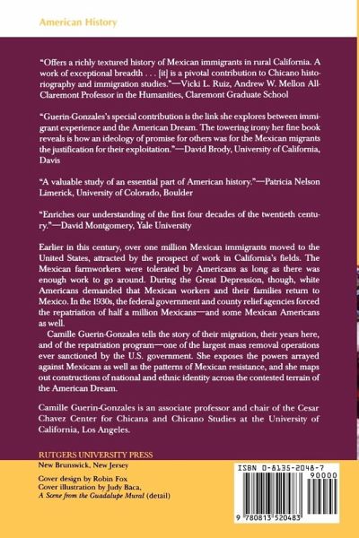 Earlier in this century, over one million Mexican immigrants moved to the United States, attracted by the prospect of work in California's fields. The Mexican farmworkers were tolerated by Americans as long as there was enough work to go around. During the Great Depression, though, white Americans demanded that Mexican workers and their families return to Mexico. In the 1930s, the federal government and county relief agencies forced the repatriation of half a million Mexicans--and some Mexican Americans as well. Camille Guerin-Gonzales tells the story of their migration, their years here, and of the repatriation program--one of the largest mass removal operations ever sanctioned by the U.S. government. She exposes the powers arrayed against Mexicans as well as the patterns of Mexican resistance, and she maps out constructions of national and ethnic identity across the contested terrain of the American Dream.
