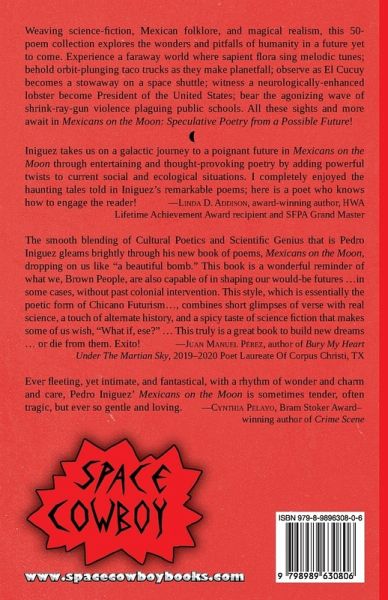 Winner of the Bram Stoker Award for Superior Achievement in Poetry Winner of the SFPA's Elgin Award for Best Speculative Poetry Book Includes the Dwarfs Stars Award winning poem "Perish and Live Forever" Includes the Rhysling Award winning poem "A Black Hole is a Melting Pot That Will Make Us Whole" Weaving science-fiction, Mexican folklore, and magical realism, this 50-poem collection explores the wonders and pitfalls of humanity in a future yet to come. Experience a faraway world where sapient flora sing melodic tunes; behold orbit-plunging taco trucks as they make planetfall; observe as El Cucuy becomes a stowaway on a space shuttle; witness a neurologically-enhanced lobster become President of the United States; bear the agonizing wave of shrink-ray-gun violence plaguing public schools. All these sights and more await in Mexicans on the Moon: Speculative Poetry from a Possible Future! "Iniguez takes us on a galactic journey to a poignant future in "Mexicans on the Moon" through entertaining and thought-provoking poetry by adding powerful twists to current social and ecological situations. I completely enjoyed the haunting tales told in Iniguez's remarkable poems, here is a poet who knows how to engage the reader!" -Linda D. Addison, award-winning author, HWA Lifetime Achievement Award recipient and SFPA Grand Master. "The smooth blending of Cultural Poetics and Scientific Genius that is Pedro Iniguez gleams brightly through his new book of poems, MEXICANS ON THE MOON, dropping on us like "a beautiful bomb." This book is a wonderful reminder of what we, Brown People, are also capable of in shaping our would-be futures and in some cases without past colonial intervention. This style, which is essentially the poetic form of Chicano Futurism, and like very few before him, combines short glimpses of verse with real science, a touch of alternate history, and a spicy taste of science fiction that makes some of us wish, "What if, ese?" The refined words within remind me of the ones I could find in the pages of OMNI and other magazines like it back in the last century when I was reading them. These words also remind me of the great possibilities for speculative poets with Spanish sounding names that are sometimes excluded from the overabundant flow of an English-speaking mainstream. But this isn't about politics. This is about Great Poetics! And MEXICANS ON THE MOON is a Great Book of Poems! I am extremely proud of Pedro Iniguez's superior endeavor. This truly is a great book to build new dreams... or die from them. Exito!" -Juan Manuel Pérez, author of Bury My Heart Under The Martian Sky, 2019-2020 Poet Laureate Of Corpus Christi, Texas "Ever fleeting, yet intimate, and fantastical, with a rhythm of wonder and charm and care, Pedro Iniguez' Mexicans on the Moon is sometimes tender, often tragic, but ever so gentle and loving." -Cynthia Pelayo, Bram Stoker Award-winning author of Crime Scene