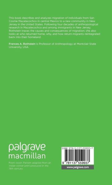 This book describes and analyzes migration of individuals from San Cosme Mazatecochco in central Mexico to a new United States community in New Jersey. Based on four decades of anthropological research in Mazatecochco and among migrants in New Jersey Rothstein traces the causes and consequences of migration and who returned home, why, and how return migrants reintegrated back into their homeland.
