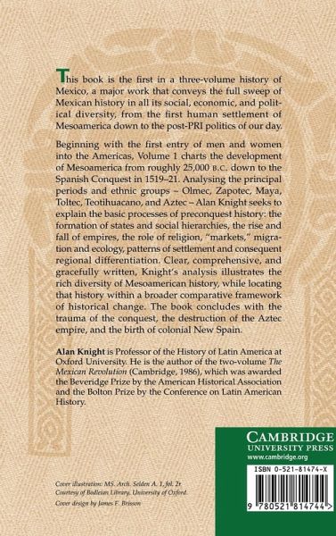 This book is the first in a three-volume history of Mexico, a major work that conveys the full sweep of Mexican history in all its social, economic, and political diversity. Volume 1 charts the development of Mesoamerica from roughly 25,000 BC down to the Spanish Conquest in 1519-21. Analysing the principal periods and ethnic groups - Olmec, Zapotec, Maya, Toltec, Teotihuacano, and Aztec - Alan Knight seeks to explain the basic processes of pre-conquest history: the formation of states and social hierarchies, the rise and fall of empires, the role of religion, 'markets', migration and ecology, patterns of settlement and consequent regional differentiation. Clear, comprehensive, and gracefully written, Knight's analysis illustrates the rich diversity of Mesoamerican history, while locating that history within a broader, comparative framework of historical change. The book concludes with the trauma of the conquest, the destruction of the Aztec empire, and the birth of colonial New Spain.