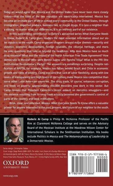 Today all would agree that Mexico and the United States have never been closer--that the fates of the two republics are inextricably intertwined. It has become an intimate part of life in almost every community in the United States, through immigration, imported produce, business ties, or illegal drugs. It is less a neighbor than a sibling; no matter what our differences, it is intricately a part of our existence. In this outstanding contribution to Oxford's acclaimed series, What Everyone Needs to Know, Roderic Ai Camp gives readers the most essential information about our sister republic to the south. Camp organizes chapters around major themes--security and violence, economic development, foreign relations, the colonial heritage, and more. He asks questions that take us beyond the headlines: Why does Mexico have so much drug violence? What was the impact of the North American Free Trade Agreement? How democratic is Mexico? Who were Benito Juárez and Pancho Villa? What is the PRI (the Institutional Revolutionary Party)? The answers are sometimes surprising. Despite ratification of NAFTA, for example, Mexico has fallen behind Brazil and Chile in economic growth and rates of poverty. Camp explains that lack of labor flexibility, along with low levels of transparency and high levels of corruption, make Mexico less competitive than some other Latin American countries. The drug trade, of course, enhances corruption and feeds on poverty; approximately 450,000 Mexicans now work in this sector. But Camp reveals that President Calderón's recent assault on narcotics smugglers--and the violence resulting from it--may have actually lessened the government's control of parts of the country and national institutions. Brisk, clear, and informed, Mexico: What Everyone Needs To Know offers a valuable primer for anyone interested in the past, present, and future of our neighbor to the South.