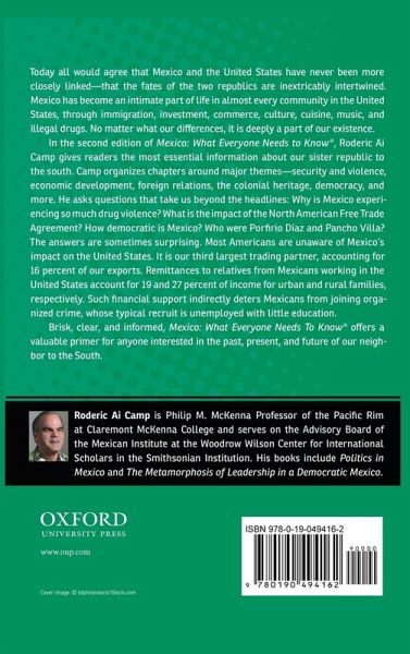 Today all would agree that Mexico and the United States have never been closer--that the fates of the two republics are inextricably intertwined. It has become an intimate part of life in almost every community in the United States, through immigration, imported produce, business ties, or illegal drugs. It is less a neighbor than a sibling; no matter what our differences, it is intricately a part of our existence. In the fully updated second edition of Mexico: What Everyone Needs to Know ®, Roderic Ai Camp gives readers the most essential information about our sister republic to the south. Camp organizes chapters around major themes--security and violence, economic development, foreign relations, the colonial heritage, and more. He asks questions that take us beyond the headlines: Why does Mexico have so much drug violence? What was the impact of the North American Free Trade Agreement? How democratic is Mexico? Who were Benito Juárez and Pancho Villa? What is the PRI (the Institutional Revolutionary Party)? The answers are sometimes surprising. Despite ratification of NAFTA, for example, Mexico has fallen behind Brazil and Chile in economic growth and rates of poverty. Camp explains that lack of labor flexibility, along with low levels of transparency and high levels of corruption, make Mexico less competitive than some other Latin American countries. The drug trade, of course, enhances corruption and feeds on poverty; approximately 450,000 Mexicans now work in this sector. Brisk, clear, and informed, Mexico: What Everyone Needs To Know® offers a valuable primer for anyone interested in the past, present, and future of our neighbor to the South.