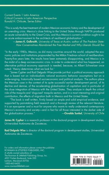 Written by two leading scholars, this book provides a detailed analysis of Mexico's political economy. James M. Cypher and Raúl Delgado Wise begin with an examination of Mexico's pivotal economic crisis of the 1980s and the consequent turn toward an export-led economy, later anchored by NAFTA. They show how Mexico, after abandoning frequently successful past practices of state-led development, disastrously tied its future to an unconditional reliance on foreign corporations to promote an export-led growth strategy. This strategy, they convincingly argue, has resulted in a fragmented economy marked by stagnation, falling wages, informal part-time employment, and massive migration, which define daily life for all but a tiny minority.