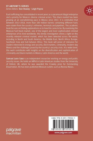 Fuel trafficking has consolidated in recent years as a paramount illegal enterprise and a priority for Mexico´s diverse criminal actors. This black market has been growing at an overwhelming pace in Mexico since 2011: it is estimated that between 2013-2018, more than 100 million barrels containing different fuels were stolen from the country´s refineries, terminals and pipelines. This academic book focuses on finding explanations as to how this came to be. By examining the Mexican fuel black market, one of the largest and most sophisticated criminal enterprises of its kind worldwide, this timely investigation shines a light on this recently relevant criminal market, which has been detected across the world, including in North and South America, the Middle East, North Africa, Europe, Southeast Asia and Sub-Saharan Africa. This book will prove of relevance for readers interested in energy and security, illicit markets, criminality, modern-day Mexico and the challenges posed by the country´s security crisis. At a wider level, this work contributes with insights on the diversification and sophistication of criminality and black markets in Mexico, Latin America and the world.