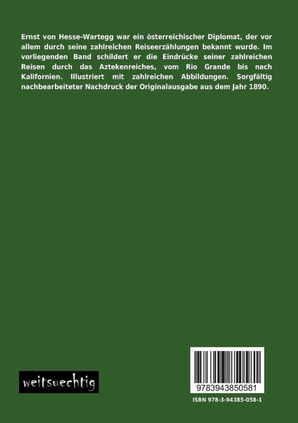 Ernst von Hesse-Wartegg war ein österreichischer Diplomat, der vor allem durch seine zahlreichen Reiseerzählungen bekannt wurde. Im vorliegenden Band schildert er die Eindrücke seiner zahlreichen Reisen durch das Aztekenreiches, vom Rio Grande bis nach Kalifornien. Illustriert mit zahlreichen Abbildungen. Sorgfältig nachbearbeiteter Nachdruck der Originalausgabe aus dem Jahr 1890.