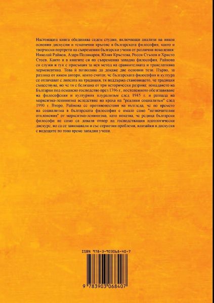 The book "Between Adaptation and Revolt. Discussions and Research Trends in Bulgarian Philosophy" brings together seven studies, which analyses some of the main discussions in Bulgarian philosophy, and offers also philosophical portraits of contemporary Bulgarian scholars of different generations: Nikolay Raynov, Azarya Polikarov, Julia Kristeva, Rosen Stupoff and Hristo Stoev. As in her previous books on Contemporary Western Philosophy, Yvanka Raynova uses here the approach of comparative and translative hermeneutics. This allows her to prove two main theses. Firstly, unlike some authors who consider Bulgarian philosophy and culture to be characterized by a lack of tradition, she maintains that tradition does exist, but that it is marked by three historical ruptures: The fall of Bulgaria under Ottoman domination in 1396, the gradual decapitation of philosophical and cultural pluralism after 1945, and the downfall of Marxism following the collapse of "real socialism" after 1990. Second, Raynova opposes the view that there were only "minor deviations" from Marxism-Leninism in Bulgarian philosophy during socialism, showing that a number of Bulgarian philoso-phers not only resisted the dominant ideological discourse, but also addressed serious issues, entering into discussion with the leading Western scholars of the time.
