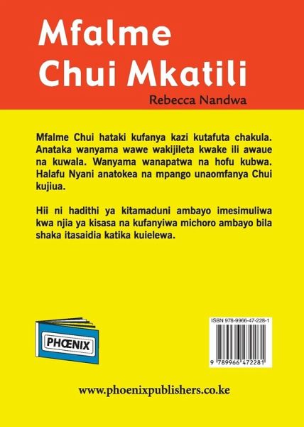 Mfalme Chui hataki kufanya kazi kutafuta chakula. Anataka wanyama wawe wakijileta kwake ili awaue na kuwala. Wanyama wanapatwa na hofu kubwa. Halafu Nyani anatokea na mpango unaomfanya Chui kujiua. Hii ni hadithi ya kitamaduni ambayo imesimuliwa kwa njia ya kisasa na kufanyiwa michoro ambayo bila shaka itasaidia katika kuielewa.