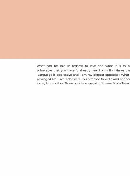 What can be said in regards to love and what it is to be vulnerable that you haven't already heard a million times over -Language is oppressive and I am my biggest oppressor. What a privileged life I live. I dedicate this attempt to write and connect to my late mother. Thank you for everything Jeanne Marie Tyser.