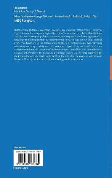 Metabotropic glutamate receptors (mGluRs) are members of the group C family of G-protein-coupled receptors. Eight different mGlu subtypes have been identified and classified into three groups based on amino acid sequence similarity, agonist pharmacology, and the signal transduction pathways to which they couple. They perform a variety of functions in the central and peripheral nervous systems, being involved in learning, memory, anxiety, and the perception of pain. They are found in pre- and postsynaptic neurons in synapses of the hippocampus, cerebellum, and cerebral cortex, as well as other…mehr