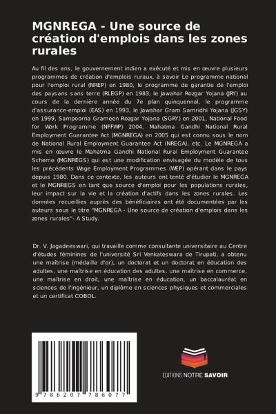 Au fil des ans, le gouvernement indien a exécuté et mis en oeuvre plusieurs programmes de création d'emplois ruraux, à savoir Le programme national pour l'emploi rural (NREP) en 1980, le programme de garantie de l'emploi des paysans sans terre (RLEGP) en 1983, le Jawahar Rozgar Yojana (JRY) au cours de la dernière année du 7e plan quinquennal, le programme d'assurance-emploi (EAS) en 1993, le Jawahar Gram Samridhi Yojana (JGSY) en 1999, Sampoorna Grameen Rozgar Yojana (SGRY) en 2001, National Food for Work Programme (NFFWP) 2004, Mahatma Gandhi National Rural Employment Guarantee Act (MGNREGA) en 2005 qui est connu sous le nom de National Rural Employment Guarantee Act (NREGA), etc. Le MGNREGA a mis en oeuvre le Mahatma Gandhi National Rural Employment Guarantee Scheme (MGNREGS) qui est une modification envisagée du modèle de tous les précédents Wage Employment Programmes (WEP) opérant dans le pays depuis 1980. Dans ce contexte, les auteurs ont tenté d'étudier le MGNREGA et le MGNREGS en tant que source d'emploi pour les populations rurales, leur impact sur la vie et la création d'actifs dans les zones rurales. Les données recueillies auprès des bénéficiaires ont été documentées par les auteurs sous le titre "MGNREGA - Une source de création d'emplois dans les zones rurales"- A Study.