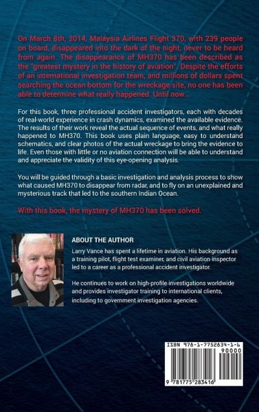 On March 8th, 2014, Malaysia Airlines Flight 370, with 239 people on board, disappeared into the dark of the night, never to be heard from again. The disappearance of MH370 has been described as the "greatest mystery in the history of aviation". Despite the efforts of an international investigation team, and millions of dollars spent searching the ocean bottom for the wreckage site, no one has been able to determine what really happened. Until now... For this book, three professional accident investigators, each with decades of real-world experience in crash dynamics, examined the available evidence. The results of their work reveal the actual sequence of events, and what really happened to MH370. This book uses plain language, easy to understand schematics, and clear photos of the actual wreckage to bring the evidence to life. Even those with little or no aviation connection will be able to understand and appreciate the validity of this eye-opening analysis. You will see that the official investigation was deficient. They missed, or misinterpreted crucial evidence that was available on the recovered wreckage pieces. Therefore, they used incorrect assumptions about what was happening onboard MH370 when they calculated the boundaries for their search zones. This book will reveal why the multi-million dollar ocean bottom search efforts had almost no chance of success. You will be guided through a basic investigation and analysis process to show what caused MH370 to disappear from radar, and to fly on an unexplained and mysterious track that led to the southern Indian Ocean. Many people have presented theories to try to explain the MH370 disappearance. This book shows you a basic investigation framework where theories that are based on speculation and guesswork can be invalidated. You are left with only one scenario that is totally based on confirmed facts. The known and indisputable evidence fits with only one chain of events, and that is the chain of events presented by the author. With this book, the mystery of MH370 has been solved.