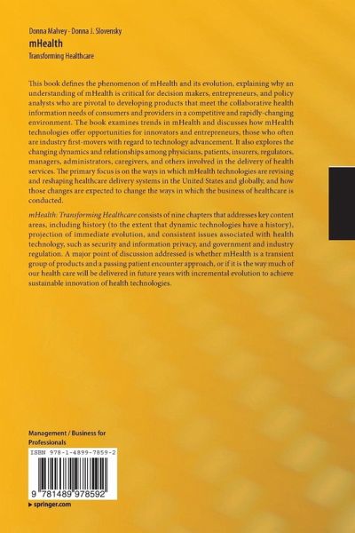 mHealth: Transforming Healthcare consists of nine chapters that addresses key content areas, including history (to the extent that dynamic technologies have a history), projection of immediate evolution and consistent issues associated with health technology, such as security and information privacy and government and industry regulation. A major point of discussion addressed is whether mHealth is a transient group of products and a passing patient encounter approach, or if it is the way much of our health care will be delivered in future years with incremental evolution to achieve sustainable innovation of health technologies.