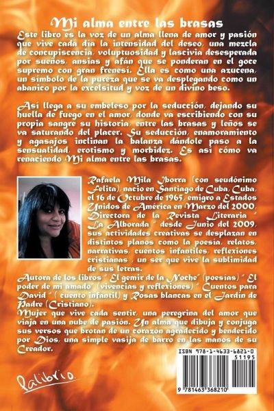Este libro es la voz de un alma llena de amor y pasión que vive cada día la intensidad del deseo, una mezcla de concupiscencia, voluptuosidad y lascivia desesperada por sueños, ansias y afán que se ponderan en el goce supremo con gran frenesí. Ella es como una azucena, un símbolo de la pureza que se va desplegando como un abanico por la excelsitud y voz de un divino beso. Así llega a su embeleso por la seducción, dejando su huella de fuego en el amor, donde va escribiendo con su propia sangre su historia, entre las brasas y leños se va saturando del placer. Su seducción, enamoramiento y agasajos inclinan la balanza dándole paso a la sensualidad, erotismo y morbidez. Es así cómo va renaciendo Mi alma entre las brasas.