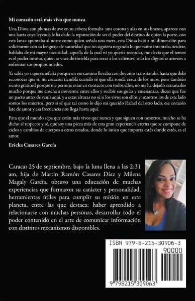 Mi corazón está más vivo que nunca Una Diosa con plumas de ave en su cabeza formaba una corona y alas en sus brazos, aparece con una lanza cuya leyenda le ha dado la reputación de ser el poder del destino de quien la porte, con esta lanza apuntaba al norte como quien señala una meta, esta Diosa bajó a mi dimensión para solicitarme con su lenguaje de autoridad que no siguiera negando lo que tanto intentaba ocultar, hablaba de mi mayor oscuridad, aquella de la cual ni yo quería recordar, me decía que el temor es el poder mismo, quien se viste de tiniebla para retar a los valientes, solo los dignos se atreven a enfrentar sus propios miedos. Ya sabía yo a que se refería porque en ese camino llevaba casi dos años transitando, hasta que debí reconocer que sí, mi corazón tiembla cuando sé que ella ronda cerca de los míos, pero también siento gratitud porque me permite estar en contacto con todos ellos, no me ha dejado extrañarles mucho porque me enseña a moverme entre ellos y recibir sus guías y enseñanzas, dicen que fue un pacto antes de venir aquí, y a estas alturas no sé si los vivos son ellos y nosotros los de este lado somos los muertos, pero si sé que tal como lo dijo mi querido Rafael del otro lado, ese corazón late de amor y esa frecuencia nos llega hasta aquí. Para que el mundo sepa que están más vivos que nunca y que siguen con nosotros, mucho se ha dicho al respecto y sé, que soy una pieza más de esta gran experiencia eterna que se compone de ciclos y cambios de cuerpos a otros estados, donde lo único que importa estés donde estés, es el amor.