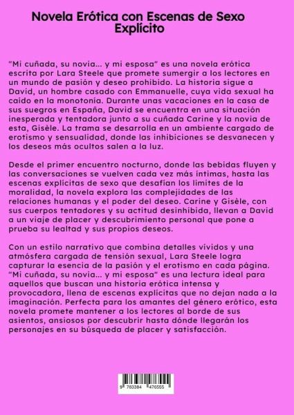 "Mi cuñada, su novia... y mi esposa" es una novela erótica escrita por Lara Steele que promete sumergir a los lectores en un mundo de pasión y deseo prohibido. La historia sigue a David, un hombre casado con Emmanuelle, cuya vida sexual ha caído en la monotonía. Durante unas vacaciones en la casa de sus suegros en España, David se encuentra en una situación inesperada y tentadora junto a su cuñada Carine y la novia de esta, Gisèle. La trama se desarrolla en un ambiente cargado de erotismo y sensualidad, donde las inhibiciones se desvanecen y los deseos más ocultos salen a la luz.Desde el primer encuentro nocturno, donde las bebidas fluyen y las conversaciones se vuelven cada vez más íntimas, hasta las escenas explícitas de sexo que desafían los límites de la moralidad, la novela explora las complejidades de las relaciones humanas y el poder del deseo. Carine y Gisèle, con sus cuerpos tentadores y su actitud desinhibida, llevan a David a un viaje de placer y descubrimiento personal que pone a prueba su lealtad y sus propios deseos.Con un estilo narrativo que combina detalles vívidos y una atmósfera cargada de tensión sexual, Lara Steele logra capturar la esencia de la pasión y el erotismo en cada página. "Mi cuñada, su novia... y mi esposa" es una lectura ideal para aquellos que buscan una historia erótica intensa y provocadora, llena de escenas explícitas que no dejan nada a la imaginación. Perfecta para los amantes del género erótico, esta novela promete mantener a los lectores al borde de sus asientos, ansiosos por descubrir hasta dónde llegarán los personajes en su búsqueda de placer y satisfacción.