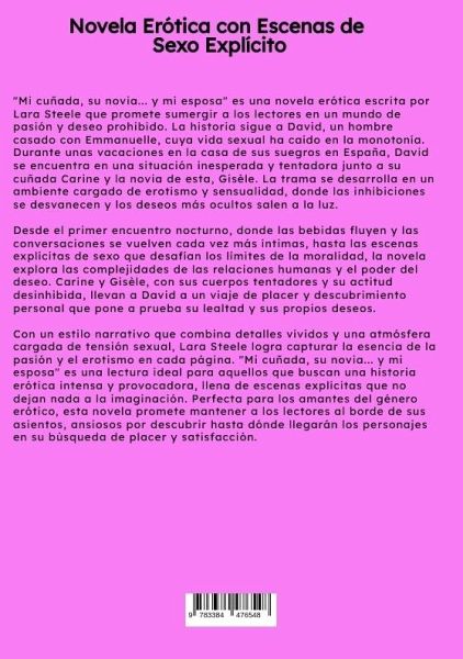 "Mi cuñada, su novia... y mi esposa" es una novela erótica escrita por Lara Steele que promete sumergir a los lectores en un mundo de pasión y deseo prohibido. La historia sigue a David, un hombre casado con Emmanuelle, cuya vida sexual ha caído en la monotonía. Durante unas vacaciones en la casa de sus suegros en España, David se encuentra en una situación inesperada y tentadora junto a su cuñada Carine y la novia de esta, Gisèle. La trama se desarrolla en un ambiente cargado de erotismo y sensualidad, donde las inhibiciones se desvanecen y los deseos más ocultos salen a la luz.Desde el primer encuentro nocturno, donde las bebidas fluyen y las conversaciones se vuelven cada vez más íntimas, hasta las escenas explícitas de sexo que desafían los límites de la moralidad, la novela explora las complejidades de las relaciones humanas y el poder del deseo. Carine y Gisèle, con sus cuerpos tentadores y su actitud desinhibida, llevan a David a un viaje de placer y descubrimiento personal que pone a prueba su lealtad y sus propios deseos.Con un estilo narrativo que combina detalles vívidos y una atmósfera cargada de tensión sexual, Lara Steele logra capturar la esencia de la pasión y el erotismo en cada página. "Mi cuñada, su novia... y mi esposa" es una lectura ideal para aquellos que buscan una historia erótica intensa y provocadora, llena de escenas explícitas que no dejan nada a la imaginación. Perfecta para los amantes del género erótico, esta novela promete mantener a los lectores al borde de sus asientos, ansiosos por descubrir hasta dónde llegarán los personajes en su búsqueda de placer y satisfacción.