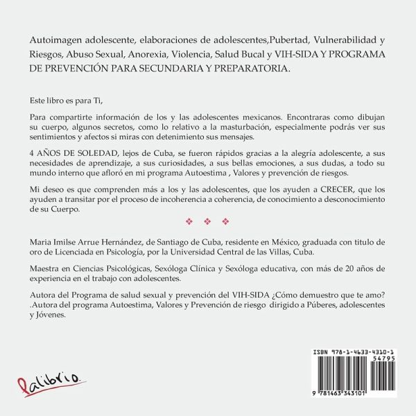 Autoimagen adolescente, elaboraciones de adolescentes,Pubertad, Vulnerabilidad y Riesgos, Abuso Sexual, Anorexia, Violencia, Salud Bucal y VIH-SIDA Y PROGRAMA DE PREVENCIÓN PARA SECUNDARIA Y PREPARATORIA. Este libro es para Ti, Para compartirte información de los y las adolescentes mexicanos. Encontraras como dibujan su cuerpo, algunos secretos, como lo relativo a la masturbación, especialmente podrás ver sus sentimientos y afectos si miras con detenimiento sus mensajes. 4 AÑOS DE SOLEDAD, lejos de Cuba, se fueron rápidos gracias a la alegría adolescente, a sus necesidades de aprendizaje, a sus curiosidades, a sus bellas emociones, a sus dudas, a todo su mundo interno que afloró en mi programa Autoestima , Valores y prevención de riesgos. Mi deseo es que comprenden más a los y las adolescentes, que los ayuden a CRECER, que los ayuden a transitar por el proceso de incoherencia a coherencia, de conocimiento a desconocimiento de su Cuerpo.