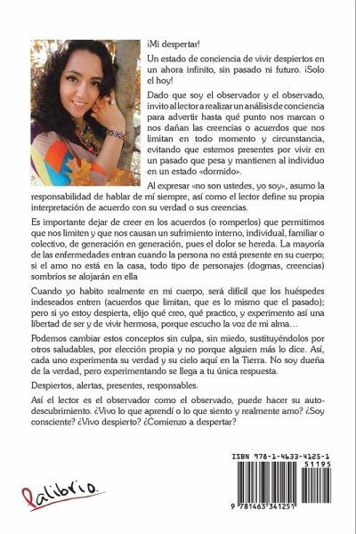 ¡Mi despertar! Un estado de conciencia de vivir despiertos en un ahora infinito, sin pasado ni futuro. ¡Solo el hoy! Dado que soy el observador y el observado, invito al lector a realizar un análisis de conciencia para advertir hasta qué punto nos marcan o nos dañan las creencias o acuerdos que nos limitan en todo momento y circunstancia, evitando que estemos presentes por vivir en un pasado que pesa y mantienen al individuo en un estado dormido. Al expresar no son ustedes, yo soy, asumo la responsabilidad de hablar de mí siempre, así como el lector define su propia interpretación de acuerdo con su verdad o sus creencias. Es importante dejar de creer en los acuerdos (o romperlos) que permitimos que nos limiten y que nos causan un sufrimiento interno, individual, familiar o colectivo, de generación en generación, pues el dolor se hereda. La mayoría de las enfermedades entran cuando la persona no está presente en su cuerpo; si el amo no está en la casa, todo tipo de personajes (dogmas, creencias) sombríos se alojarán en ella Cuando yo habito realmente en mi cuerpo, será difícil que los huéspedes indeseados entren (acuerdos que limitan, que es lo mismo que el pasado); pero si yo estoy despierta, elijo qué creo, qué practico, y experimento así una libertad de ser y de vivir hermosa, porque escucho la voz de mi alma... Podemos cambiar estos conceptos sin culpa, sin miedo, sustituyéndolos por otros saludables, por elección propia y no porque alguien más lo dice. Así, cada uno experimenta su verdad y su cielo aquí en la Tierra. No soy dueña de la verdad, pero experimentando se llega a tu única respuesta. Despiertos, alertas, presentes, responsables. Así el lector es el observador como el observado, puede hacer su autodescubrimiento. ¿Vivo lo que aprendí o lo que siento y realmente amo? ¿Soy consciente? ¿Vivo despierto? ¿Comienzo a despertar?
