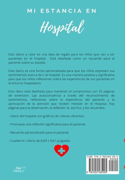 Este diario a color es una idea de regalo para los niños que van a ser pacientes en el hospital. Está diseñada como un recuerdo para el paciente sobre su estadía. Este diario es una forma personalizada para que los niños expresen sus sentimientos acerca de ir al hospital. Es una manera positiva y significativa para que los niños reflexionen sobre las experiencias de sus pacientes en el entorno hospitalario. Esta diaro está diseñada para mantener el compromiso con 25 páginas de extensión. Las entradas del diario son una combinación de preguntas que promueven la autoconciencia a través del reconocimiento de sentimientos, reflexiones sobre la experiencia del paciente y la apreciación de la atención que reciben mientras están en el Hospital. Hay páginas para la observación, la reflexión, la escritura y los recuerdos. - Diario del hospital con gráficos de colores vibrantes. - Promueve una reflexión significativa para el paciente. - Recuerdo personalizado para el paciente - Cuaderno / diario de 6,69 x 9,61 pulgadas