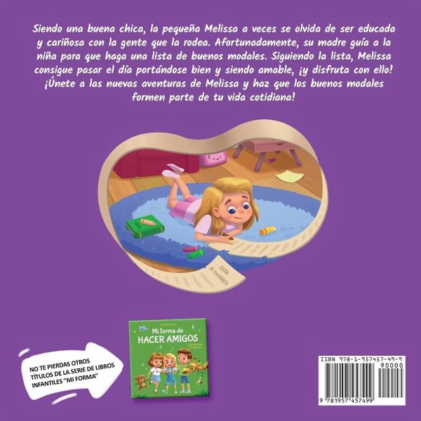 Encontrar libros de modales confiables y útiles como éste, puede representar un verdadero reto. En este libro de cuentos para niños en español nos presentan una hermosa historia que puede ser de gran ayuda a los padres para enseñar habilidades sociales, respeto y amabilidad tanto a sus hijos pequeños como a los mayores. En este libro en español para niños podrán disfrutar las divertidas aventuras de la pequeña Melissa que ayudarán a enseñar acerca de buenos modales, etiqueta y comportamiento a los niños. Este es uno de los libros en español para niños que a través de las aventuras de la pequeña Melissa, ayuda a enseñar habilidades sociales a los pequeños. Nos cuenta la historia de la encantadora Melissa, una pequeña que al principio de la historia carece de buenos modales por lo que ningún niño quiere jugar con ella. Poco a poco, a lo largo de la historia, va aprendiendo a ser educada y a convivir cordialmente con los demás pequeños. Este libro para niños aporta diferentes enseñanzas como:Habilidades sociales para niños. Ayuda a que aprendan sobre normas sociales. Enfatiza la amabilidad. Enseña la importancia de la empatía hacia los demás. Este cuento en español capta fácilmente la atención de niños y niñas al presentar una interesante historia que podría ocurrir en la vida diaria, por lo que los pequeños se pueden sentir identificados con dicha situación. Este libro de cuentos infantiles nos presenta una divertida aventura con problemas y soluciones que los niños disfrutarán al máximo mientras aprenden sobre buenos modales y etiqueta. Este libro de niños en español también es una excelente opción para aquellos pequeños que están empezando a leer. Este libro de cuentos en español cuenta con bellas rimas que fomentan que los niños lean junto con sus padres. Nuestro interesante y divertido libro en español será una gran adición a la biblioteca de pequeños que empiezan a leer. Este libro de buenos modales para niños incluye hermosas ilustraciones que harán más dinámica la lectura mientras enseñan etiqueta y buen comportamiento a los pequeños a través de una historia con la que se pueden identificar fácilmente. Este libro infantil en español enseña buenos modales como el comportamiento en la mesa durante cada comida, enfatiza la importancia de ser amable y empático con los demás y también es de gran utilidad para que los niños aprendan frases de cortesía. ¡No dudes más! Agrega este libro en español para niños acerca de buenos modales a tu biblioteca.