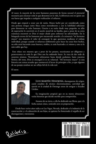 Al nacer, la mayoría de los seres humanos poseemos de forma natural el potencial necesario para alcanzar todo lo que deseamos en la vida, la diferencia está en quien usa esa fuerza que impulsa a cualquier realización: el esfuerzo. Desde que empezó a tener uso de razón, Mateo luchó por ser considerado como una persona íntegra tanto física como mentalmente y con la habilidad suficiente para demostrar su valor humano. Gracias a su tesón desde muy pequeño, su afán de superación lo convirtió en el sostén moral de su familia, pues a pesar de su corta existencia encontró en Dios el mejor aliado para enfrentar las adversidades. En la búsqueda eterna de los humanos por encontrarle sentido a la existencia "mi hermano mayor" nos muestra el valor de conseguir lo que queremos mediante el trabajo individual, porque cuando te esfuerzas noblemente para hacer las cosas bien hechas, no sólo estás haciendo cosas buenas y nobles, te estás haciendo a ti mismo y esto es lo más noble que hay. Este relato nos muestra que a pesar de los pesares, necesitamos ser diligentes y perseverantes en todo lo que Dios nos ha ordenado hacer. Se trata de dar todo de nosotros mismos. Necesitamos esforzarnos hasta donde podamos, hasta nuestros límites; del resto, Dios se encargará si es su voluntad. "Mi hermano mayor" es una historia con temas actuales que conmoverá al lector de principio a fin, ya que algunos de sus pasajes resultan ser un reflejo fiel de la vida real. El autor.
