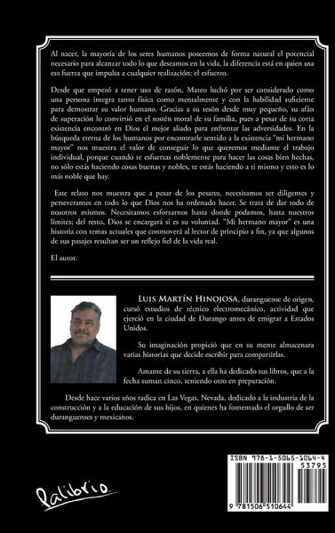 Al nacer, la mayoría de los seres humanos poseemos de forma natural el potencial necesario para alcanzar todo lo que deseamos en la vida, la diferencia está en quien usa esa fuerza que impulsa a cualquier realización: el esfuerzo. Desde que empezó a tener uso de razón, Mateo luchó por ser considerado como una persona íntegra tanto física como mentalmente y con la habilidad suficiente para demostrar su valor humano. Gracias a su tesón desde muy pequeño, su afán de superación lo convirtió en el sostén moral de su familia, pues a pesar de su corta existencia encontró en Dios el mejor aliado para enfrentar las adversidades. En la búsqueda eterna de los humanos por encontrarle sentido a la existencia "mi hermano mayor" nos muestra el valor de conseguir lo que queremos mediante el trabajo individual, porque cuando te esfuerzas noblemente para hacer las cosas bien hechas, no sólo estás haciendo cosas buenas y nobles, te estás haciendo a ti mismo y esto es lo más noble que hay. Este relato nos muestra que a pesar de los pesares, necesitamos ser diligentes y perseverantes en todo lo que Dios nos ha ordenado hacer. Se trata de dar todo de nosotros mismos. Necesitamos esforzarnos hasta donde podamos, hasta nuestros límites; del resto, Dios se encargará si es su voluntad. "Mi hermano mayor" es una historia con temas actuales que conmoverá al lector de principio a fin, ya que algunos de sus pasajes resultan ser un reflejo fiel de la vida real. El autor.