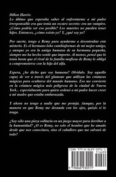 Dillon Harris: Lo último que esperaba saber al enfrentarme a mi padre irresponsable era que tenía un oscuro secreto: era un vampiro. ¿Cómo podría ser eso posible? Los muertos no pueden tener hijos. Entonces, ¿cómo existo yo? Y, ¿qué soy yo? Por suerte, tengo a Remy para ayudarme a desentrañar este misterio. Es el hermano lobo cambiaformas de mi mejor amigo, y aunque yo era la amiga humana de su hermana pequeña, siempre me ha hecho sentir que importo. Al menos, pensé que lo tenía hasta que el rival de la familia mafiosa de Remy le obligó a comprometerse con la hija del alfa. Espera, ¿he dicho que soy humana? Olvídalo. Soy aquello capaz de ver a través del glamour que utilizan las criaturas mágicas para ocultarse del mundo humano. Eso me convierte en la criatura mágica más peligrosa de la ciudad de Nueva York... especialmente para quien ordenó a mi padre hacer creer a mi madre que estaba embarazada. Y ahora no tengo a nadie que me proteja. Aunque, por la manera en que Remy me desnuda con los ojos, quizás sí lo tenga. ¿Soy sólo una pieza solitaria en un juego mayor para derribar a la humanidad? ¿O es Remy, no solo el hombre que he amado desde que nos conocimos, sino el caballero que me salvará de todo? Nota: Este libro es parte de la colección 'El Amor es Amor' del autor, lo que significa que está disponible como un romance picante en 'El Matrimonio Forzado de mi Novio con la Mafia', un apasionante romance de cambiaformas lobo en 'Mi Lobo Mafioso', un romance entre hombres en ' Problemas de Matrimonio Mafioso', y un romance M/M de cambiantes lobo en 'Su Protector Lobo'.