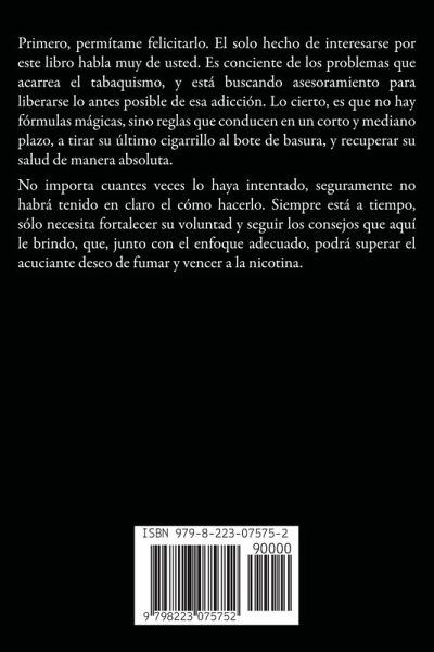 Primero, permítame felicitarlo. El solo hecho de interesarse por este libro habla muy de usted. Es conciente de los problemas que acarrea el tabaquismo, y está buscando asesoramiento para liberarse lo antes posible de esa adicción. Lo cierto, es que no hay fórmulas mágicas, sino reglas que conducen en un corto y mediano plazo, a tirar su último cigarrillo al bote de basura, y recuperar su salud de manera absoluta. No importa cuantes veces lo haya intentado, seguramente no habrá tenido en claro el cómo hacerlo. Siempre está a tiempo, sólo necesita fortalecer su voluntad y seguir los consejos que aquí le brindo, que, junto con el enfoque adecuado, podrá superar el acuciante deseo de fumar y vencer a la nicotina.