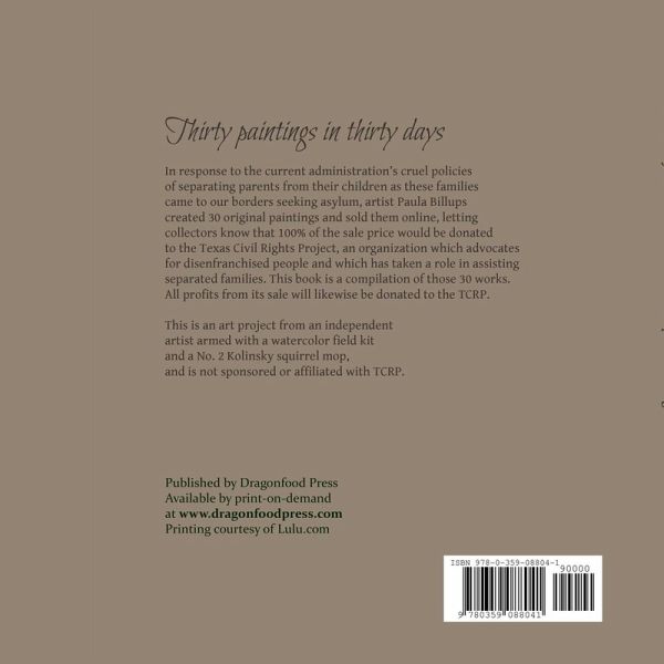 In the summer of 2018, in response to the government's cruel policies of separating families at the border who were seeking asylum, artist Paula Billups created 30 paintings in 30 days and sold them online. She donated 100%% of the profits to the Texas Civil Rights Project, which advocates for disenfranchised people and which played a role in assisting these refugees with their legal and logistical needs. This book is a compilation of those works, and 100%% of the profit from its sale will also be donated to the TCRP. Ms. Billups conceived this project independently, and is not affiliated with the TCRP.