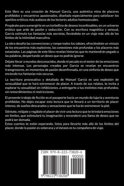 Este libro es una creación de Manuel García, una auténtica mina de placeres prohibidos y encuentros apasionados, diseñada especialmente para satisfacer los apetitos eróticos más audaces de los lectores adultos homosexuales. Prepárate para sumergirte en un torbellino de deseos inconfesables, en un universo erótico que arde de pasión y seducción. Con su escritura magnética y sensual, García estimula tus fantasías más secretas, llevándote en un viaje más allá de los límites de la intimidad masculina. La obra desafía las convenciones y rompe todos los tabúes, ofreciéndote un vistazo de los encuentros más explosivos, las conexiones más profundas y los placeres más extasiados. Las páginas de este libro revelan historias que te mantendrán pegado a las palabras, despertando un deseo que no podrás ignorar. Déjate llevar a mundos desconocidos, donde el pecado es el motor de las emociones más intensas. Los personajes creados por García se revelan en encuentros transgresores, en momentos de pasión desenfrenada, en una sinfonía de deseo que enciende tus fantasías más oscuras. La escritura provocativa y detallada de Manuel García es una explosión de sensualidad que te hará estremecer de placer. A través de sus relatos, te invita a explorar tu sexualidad sin inhibiciones, a entregarte a tus instintos más profundos, sin remordimientos ni restricciones. El presente trabajo de ficción es el pasaporte hacia un mundo de lujuria y aventuras prohibidas. No dejes escapar esta lectura que te llevará a un territorio de placer intenso, de sueños descarados y sensaciones que te harán estremecer la piel. Siéntate, relájate y regálate el placer de vivir una lectura que te brindará emociones sin límites, que estimulará tu imaginación y encenderá una llama de deseo que no podrá ser domada. Estos cuentos te están esperando, listos para llevarte más allá de los límites del placer, donde la pasión es soberana y el éxtasis es tu compañera de viaje.