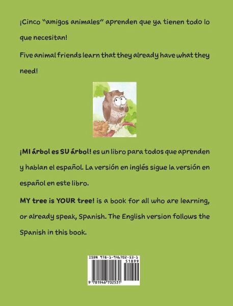 ¡Cinco "amigos animales" aprenden que ya tienen todo lo que necesitan! (Five animal friends learn that they already have what they need!) ¡MI árbol es SU árbol! es un libro para todos que aprenden y hablan el español. La versión en inglés sigue la versión en español en este libro. (MY tree is YOUR tree! is a book for all who are learning, or already speak, Spanish. The English version follows the Spanish in this book.)