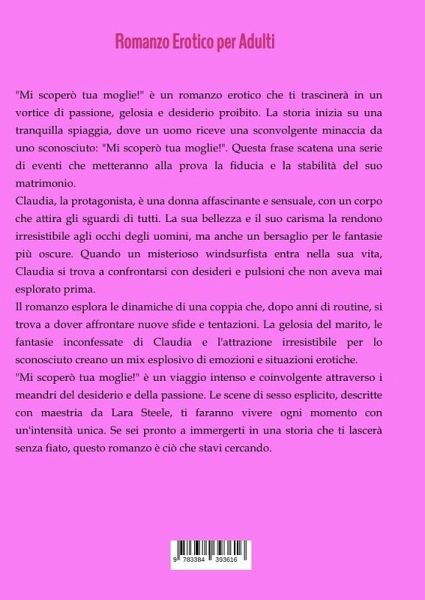 "Mi scoperò tua moglie!" è un romanzo erotico che ti trascinerà in un vortice di passione, gelosia e desiderio proibito. La storia inizia su una tranquilla spiaggia, dove un uomo riceve una sconvolgente minaccia da uno sconosciuto: "Mi scoperò tua moglie!". Questa frase scatena una serie di eventi che metteranno alla prova la fiducia e la stabilità del suo matrimonio.Claudia, la protagonista, è una donna affascinante e sensuale, con un corpo che attira gli sguardi di tutti. La sua bellezza e il suo carisma la rendono irresistibile agli occhi degli uomini, ma anche un bersaglio per le fantasie più oscure. Quando un misterioso windsurfista entra nella sua vita, Claudia si trova a confrontarsi con desideri e pulsioni che non aveva mai esplorato prima.Il romanzo esplora le dinamiche di una coppia che, dopo anni di routine, si trova a dover affrontare nuove sfide e tentazioni. La gelosia del marito, le fantasie inconfessate di Claudia e l'attrazione irresistibile per lo sconosciuto creano un mix esplosivo di emozioni e situazioni erotiche."Mi scoperò tua moglie!" è un viaggio intenso e coinvolgente attraverso i meandri del desiderio e della passione. Le scene di sesso esplicito, descritte con maestria da Lara Steele, ti faranno vivere ogni momento con un'intensità unica. Se sei pronto a immergerti in una storia che ti lascerà senza fiato, questo romanzo è ciò che stavi cercando.