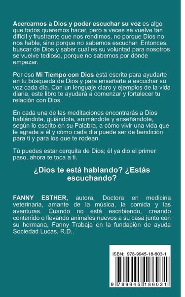 Acercarnos a Dios y poder escuchar su voz es algo que todos queremos hacer, pero a veces se vuelve tan difícil y frustrante que nos rendimos, no porque Dios no nos hable, sino porque no sabemos escuchar. Entonces, buscar de Dios y saber cuál es su voluntad para nosotros se vuelve tedioso, porque no sabemos por dónde empezar. Por eso Mi Tiempo con Dios está escrito para ayudarte en tu búsqueda de Dios y para enseñarte a escuchar su voz cada día. Con un lenguaje claro y ejemplos de la vida diaria, este libro te ayudará a comenzar y fortalecer tu relación con Dios. En cada una de las meditaciones encontrarás a Dios hablándote, guiándote, animándote y enseñándote, según lo escrito en su Palabra, a cómo vivir una vida que le agrade a él y cómo cada día puede ser de bendición para ti y para los que te rodean. Tú puedes estar cerquita de Dios; Él ya dio el primer paso, ahora te toca a ti.