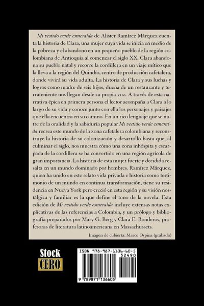 Mi vestido verde esmeralda by Alister Ramírez Márquez recounts the life story of Clara, born poor in isolated, rural Colombia in 1900, who makes her way, after a mythic journey through forests, mountains and swamps to the western region of the Quindío, to the city of Armenia, now the heart of coffee and banana production. This remarkable novel, first published in 2003, is the tale of Clara's adventurous journey and subsequent rise to prosperity as the owner of a farm and restaurant and mother of six, ending with years of political strife and the dissolution of her family. The novel provides an overview of a century of dramatic strife and change in Clara's personal trajectory and in the history of the nation. Alister Ramírez Márquez is from this area of Colombia, but lives in New York; he is the author of a number of books, and Mi vestido verde esmeralda is his first novel, fusing familiarity and nostalgia in this tale of a journey through the twentieth century. This novel would be engaging reading in courses on Colombian history or literature, and in courses on topics of search for self-definition (personal and national), fluctuating cycles and rhythms of a century of transitions, life as a journey, or the meaning of progress. This edition of Mi vestido verde esmeralda includes extensive annotation of the Colombian references, and a prologue and bibliography by Clara E. Ronderos and Mary G. Berg, professors of Latin American literature in Massachusetts.