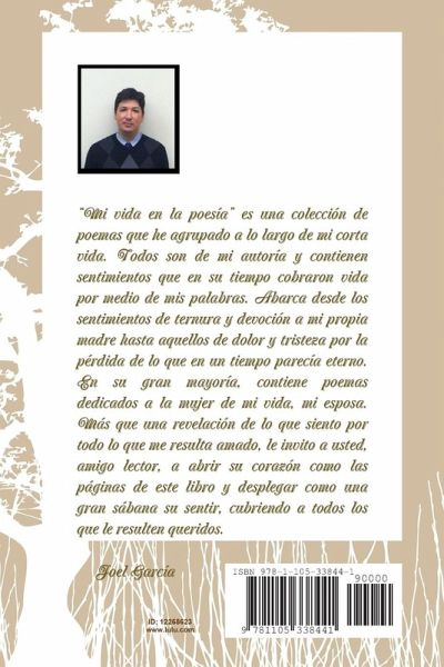 "Mi vida en la poesía" es una colección de poemas que he agrupado a lo largo de mi corta vida. Todos son de mi autoría y contienen sentimientos que en su tiempo cobraron vida por medio de mis palabras. Abarca desde los sentimientos de ternura y devoción a mi propia madre hasta aquellos de dolor y tristeza por la pérdida de lo que en un tiempo parecía eterno. En su gran mayoría, contiene poemas dedicados a la mujer de mi vida, mi esposa. Más que una revelación de lo que siento por todo lo que me resulta amado, le invito a usted, amigo lector, a abrir su corazón como las páginas de este libro y desplegar como una gran sábana su sentir, cubriendo a todos los que le son queridos. Joel García