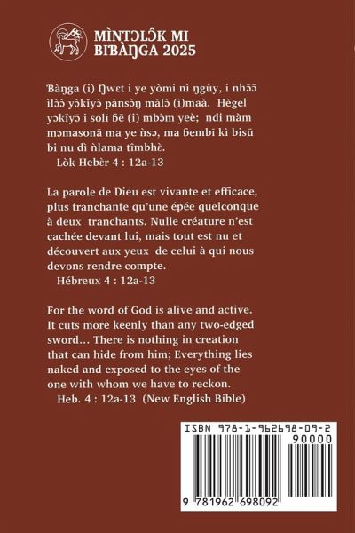 A translation of the Moravian Daily Texts in the ɓàsàa language of Cameroon for the year 2025, featuring Literacy in Cameroonian languages and Evangelism by Pierre Emmanuel NJOCK (PEN). Started since 1980, now the 45th edition in 2025, Mìntɔlɔ̂k mi Biɓàŋga, as a Translation of the Moravian Daily Texts, beholds a three-prong goal and vision: 1. 1. The daily reading of the Holy Scriptures in the ɓàsàa language (Devotional) 2. Literacy in Cameroonian national languages starting with ɓàsàa 3. Life Transformation through the Daily Reading of Holy Scriptures and the knowledge of Jesus-Christ as Lord and Savior. PEN, the author and translator educated at the Evangelical Missions Institute, then later pursued Higher Studies in Heidelberg, Strasbourg, and Laval Universities, earning a Ph.D. in Linguistics. PEN has held various academic and administrative roles, including positions at Laval University, University of Yaoundé, and as Principal of the Evangelical College of Libamba. He co-founded CABTAL (Cameroon Bible Translation Association and Literacy) and was a member of the Wycliffe International Board. In 1995, he founded the Basaa Language Subcommitee (SCOBA) and became the first President of the Basaa Language Committee (COLBA) in 1998. Une traduction des Paroles et Textes Moraves en langue ɓàsàa du Cameroun pour l'année 2025, avec un point focal sur l'alphabétisation en langues camerounaises et l'évangélisation par Pierre Emmanuel NJOCK (PEN).Initiée depuis 1980, et aujourd'hui la 45e édition en 2025, Mìntɔlɔ̂k mi Biɓàŋga, en tant que traduction des Paroles et Textes moraves, vise un triple objectif: 1. La lecture quotidienne des Saintes Écritures en langue ɓàsàa (Dévotion) 2. Alphabétisation dans les langues nationales camerounaises commençant par la langue ɓàsàa 3. Transformation de vie par la lecture quotidienne des Saintes Écritures et la connaissance de Jésus-Christ comme Seigneur et Sauveur.PEN, l'auteur et traducteur a été formé à l'Institut des Missions Évangéliques, a ensuite poursuivi des études supérieures dans les universités de Heidelberg, de Strasbourg et de Laval, obtenant un doctorat en linguistique.PEN a occupé divers postes académiques et administratifs, notamment à l'Université Laval, à l'Université de Yaoundé et en tant que directeur du Collège évangélique de Libamba (CEL). Il a cofondé la CABTAL (Cameroon Bible Translation Association and Literacy) et a été membre du conseil d'administration de Wycliffe International. En 1995, il fonde le Sous-Comité de Langue Ɓàsàa (SCOBA) et devient le premier président du Comité de Langue Ɓàsàa (COLBA) en 1998.