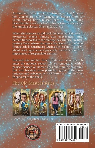 At their local show in Dublin, twelve year old Mia and her Connemara pony, Mango, are surprised to see young horses being pushed hard in competitions. Disturbed by a conversation between two trainers about the jumping classes, Mia's unease grows. When she borrows an old book on horsemanship from a mysterious mobile library, Mia unexpectedly finds herself transported to the Manège des Tuileries in 18th-century Paris, where she meets the legendary horseman François de la Guérinière. During her lesson, Mia learns about what ages horses physically mature at, and the importance of responsible training. Inspired, she and her friends Kate and Liam decide to enter the national school science competition with a project focused on horse's ages and training programs. But with backlash from powerful figures in the horse industry and sabotage at every turn, can Mia and her friends get to the finals? Brimming with horse riding tips, fascinating equestrian history, and a touch of time travel magic, this exciting pony adventure is perfect for horse lovers aged 8 to 14 and is an ideal gift for birthdays and Christmas. The Old Masters Series This book is part of the Old Masters series. The Old Masters series is a remarkable historical time travel series, celebrating the famous historical figures including Antonie de Pluvinel, William Cavendish, the first Duke of Newcastle, and François Robichon de La Guérinière. This captivating pony adventure series is written by award-winning Irish equestrian author, Elaine Heney.