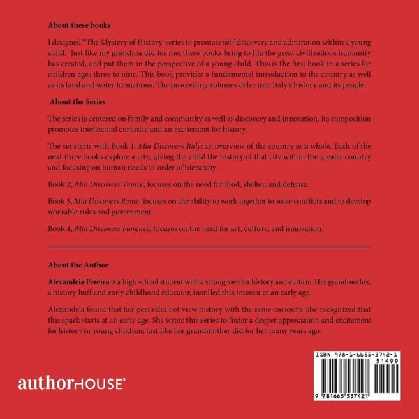 About these books I designed "The Mystery of History' series to promote self-discovery and admiration within a young child. Just like my grandma did for me; these books bring to life the great civilizations humanity has created, and put them in the perspective of a young child. This is the first book in a series for children ages three to nine. This book provides a fundamental introduction to the country as well as its land and water formations. The proceeding volumes delve into Italy's history and its people. About the Series The series is centered on family and community as well as discovery and innovation. Its composition promotes intellectual curiosity and an excitement for history. The set starts with Book 1, Mia Discovers Italy; an overview of the country as a whole. Each of the next three books explore a city; giving the child the history of that city within the greater country and focusing on human needs in order of hierarchy. Book 2, Mia Discovers Venice, focuses on the need for food, shelter, and defense. Book 3, Mia Discovers Rome, focuses on the ability to work together to solve conflicts and to develop workable rules and government. Book 4, Mia Discovers Florence, focuses on the need for art, culture, and innovation.