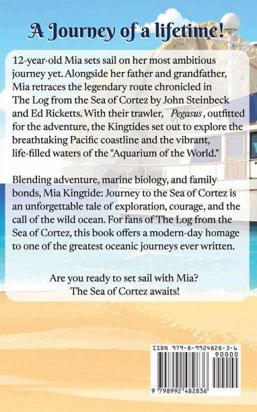 A Journey of Discovery, Adventure, and the Fight to Protect Our Oceans! Twelve-year-old Mia Kingtide is no ordinary explorer. With her unique connection to the ocean and a heart dedicated to its preservation, Mia embarks on her most daring adventure yet-a two-month voyage aboard Pegasus, her family's 34-foot trawler, to the Sea of Cortez. Joining her dad, Luke, and her grandfather, Jim, Mia sets sail along the stunning California coastline, navigating through iconic stops like Morro Bay, Santa Barbara, and Catalina Island before crossing into Mexican waters. Along the way, they encounter breathtaking marine life, playful sea lions, majestic gray whales, and mysterious creatures of the deep. But the ocean is not without its challenges. From navigating environmental threats to encountering rogue fishing practices, Mia must rely on her courage, wit, and love for the ocean to make a difference. Inspired by the legendary journey of John Steinbeck and Ed Ricketts, Mia Kingtide: Journey to the Sea of Cortez is a thrilling tale of family bonds, marine biology, and the fight to protect our fragile ecosystems. Perfect for fans of adventure, environmental stewardship, and stories that inspire young readers to make waves in the world.
