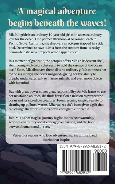 A magical adventure begins beneath the waves! Mia Kingtide is an ordinary 10-year-old girl with an extraordinary love for the ocean. One perfect afternoon at Asilomar Beach in Pacific Grove, California, she discovers an octopus trapped in a tide pool. Determined to save it, Mia frees the creature from its rocky prison-but she never expects what happens next. In a moment of gratitude, the octopus offers Mia an iridescent shell, shimmering with colors that seem to hold the essence of the ocean itself. Soon, Mia discovers the shell is no ordinary gift. It connects her to the sea in ways she never imagined-giving her the ability to breathe underwater, talk to marine animals, and even move objects with her mind. But with great power comes great responsibility. As Mia learns to use her newfound abilities, she finds herself on a mission to protect the ocean and its incredible creatures. From rescuing tangled sea life to cleaning up polluted waters, Mia realizes she's been given a gift that can change the world-if she's brave enough to embrace it. Join Mia as her magical journey begins in this heartwarming, action-packed story about courage, compassion, and the bond between humans and the sea. Perfect for readers who love adventure, marine animals, and stories that inspire!