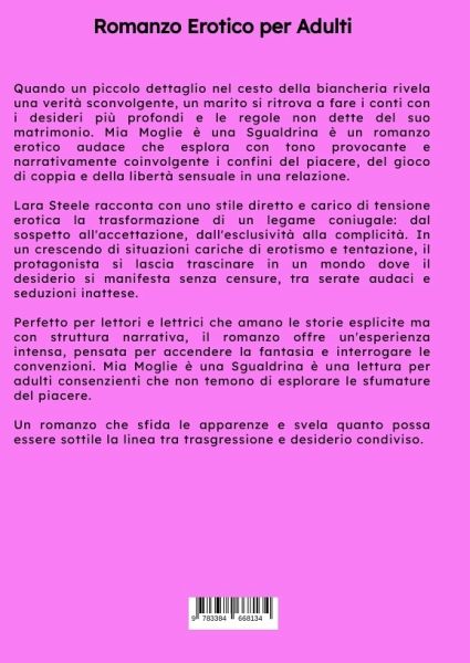 Quando un piccolo dettaglio nel cesto della biancheria rivela una verità sconvolgente, un marito si ritrova a fare i conti con i desideri più profondi e le regole non dette del suo matrimonio. Mia Moglie è una Sgualdrina è un romanzo erotico audace che esplora con tono provocante e narrativamente coinvolgente i confini del piacere, del gioco di coppia e della libertà sensuale in una relazione.Lara Steele racconta con uno stile diretto e carico di tensione erotica la trasformazione di un legame coniugale: dal sospetto all'accettazione, dall'esclusività alla complicità. In un crescendo di situazioni cariche di erotismo e tentazione, il protagonista si lascia trascinare in un mondo dove il desiderio si manifesta senza censure, tra serate audaci e seduzioni inattese.Perfetto per lettori e lettrici che amano le storie esplicite ma con struttura narrativa, il romanzo offre un'esperienza intensa, pensata per accendere la fantasia e interrogare le convenzioni. Mia Moglie è una Sgualdrinaè una lettura per adulti consenzienti che non temono di esplorare le sfumature del piacere.Un romanzo che sfida le apparenze e svela quanto possa essere sottile la linea tra trasgressione e desiderio condiviso.