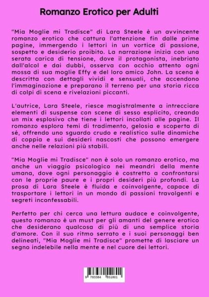 "Mia Moglie mi Tradisce" di Lara Steele è un avvincente romanzo erotico che cattura l'attenzione fin dalle prime pagine, immergendo i lettori in un vortice di passione, sospetto e desiderio proibito. La narrazione inizia con una serata carica di tensione, dove il protagonista, inebriato dall'alcol e dai dubbi, osserva con occhio attento ogni mossa di sua moglie Effy e del loro amico John. La scena è descritta con dettagli vividi e sensuali, che accendono l'immaginazione e preparano il terreno per una storia ricca di colpi di scena e rivelazioni piccanti.L'autrice, Lara Steele, riesce magistralmente a intrecciare elementi di suspense con scene di sesso esplicito, creando un mix esplosivo che tiene i lettori incollati alle pagine. Il romanzo esplora temi di tradimento, gelosia e scoperta di sé, offrendo uno sguardo crudo e realistico sulle dinamiche di coppia e sui desideri nascosti che possono emergere anche nelle relazioni più stabili."Mia Moglie mi Tradisce" non è solo un romanzo erotico, ma anche un viaggio psicologico nei meandri della mente umana, dove ogni personaggio è costretto a confrontarsi con le proprie paure e i propri desideri più profondi. La prosa di Lara Steele è fluida e coinvolgente, capace di trasportare i lettori in un mondo di passioni travolgenti e segreti inconfessabili.Perfetto per chi cerca una lettura audace e coinvolgente, questo romanzo è un must per gli amanti del genere erotico che desiderano qualcosa di più di una semplice storia d'amore. Con il suo ritmo serrato e i suoi personaggi ben delineati, "Mia Moglie mi Tradisce" promette di lasciare un segno indelebile nella mente e nel cuore dei lettori.