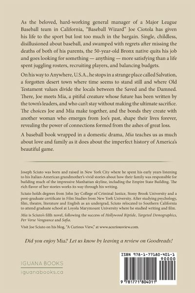 As the beloved, hard-working general manager of a Major League Baseball team in California, "Baseball Wizard" Joe Ciotola has given his life to the sport but lost too much in the bargain. Single, childless, disillusioned about baseball, and swamped with regrets after missing the deaths of both of his parents, the 50-year-old Bronx native quits his job and goes looking for something - anything - more satisfying than a life spent juggling rosters, recruiting players, and balancing budgets. On his way to Anywhere, U.S.A., he stops in a strange place called Salvation, a forgotten desert town where time seems to stand still and where Old Testament values divide the locals between the Saved and the Damned. There, Joe meets Mia, a pitiful creature whose future has been written by the town's leaders, and who can't stay without making the ultimate sacrifice. The choices Joe and Mia make together, and the bonds they create with another woman who emerges from Joe's past, shape their lives forever, revealing the power of connections formed from the ashes of great loss. A baseball book wrapped in a domestic drama, Mia teaches us as much about love and family as it does about the imperfect history of America's beautiful game.
