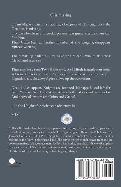 Q is missing. Quinn Magary, patron, supporter, champion of the Knights of the Octagon, is missing. Five days late from a three-day personal assignment, and no one can find him. Then Grace Painter, another member of the Knights, disappears without warning. The remaining Knights-Tav, Luke, and Micah-vow to find their friends and mentors. Then someone runs Tav off the road. And Micah is nearly murdered at Grace Painter's worksite. An innocent lunch date becomes a conflagration as a shadowy figure blows up the restaurant. Dead bodies appear. Knights are battered, kidnapped, and left for dead. Who is after them? Why? What can they do to end the attacks? And above all, where are Quinn and Grace? Join the Knights for their next adventure in: MIA
