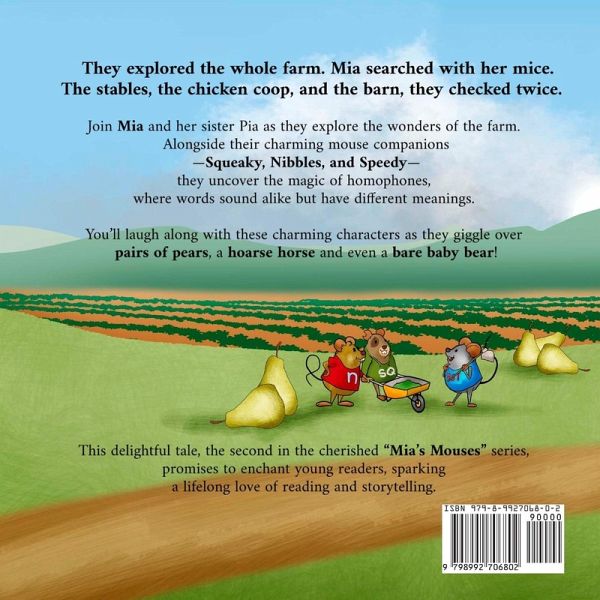They explored the whole farm. Mia searched with her mice.The stables, the chicken coop, and the barn, they checked twice. Join Mia and her sister Pia as they explore the wonders of the farm. Alongside their charming mouse companions-Squeaky, Nibbles, and Speedy-they uncover the magic of homophones, where words sound alike but have different meanings. You'll laugh along with these charming characters as they giggle over pairs of pears, a hoarse horse and even a bare baby bear! This delightful tale, the second in the cherished "Mia's Mouses" series, promises to enchant young readers, sparking a lifelong love of reading and storytelling. A must-have for every child's library.