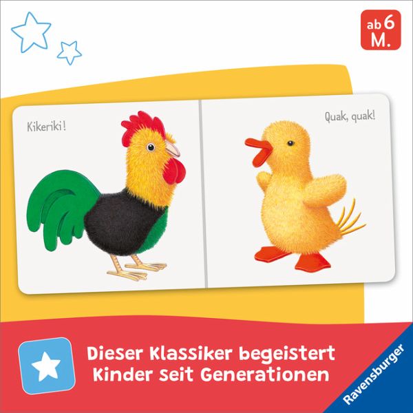 Wer macht miau und wer Wau-wau? Babys und Kleinkinder lernen in diesem Buch die bekanntesten Tiere anhand ihrer Laute kennen.
