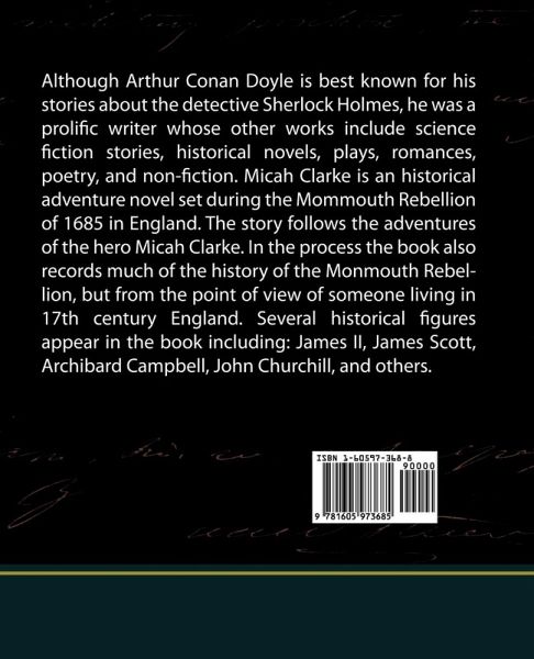Although Arthur Conan Doyle is best known for his stories about the detective Sherlock Holmes, he was a prolific writer whose other works include science fiction stories, historical novels, plays, romances, poetry, and non-fiction. Micah Clarke is an historical adventure novel set during the Mommouth Rebellion of 1685 in England. The story follows the adventures of the hero Micah Clarke. In the process the book also records much of the history of the Monmouth Rebellion, but from the point of view of someone living in 17th century England. Several historical figures appear in the book including: James II, James Scott, Archibard Campbell, John Churchill, and others.